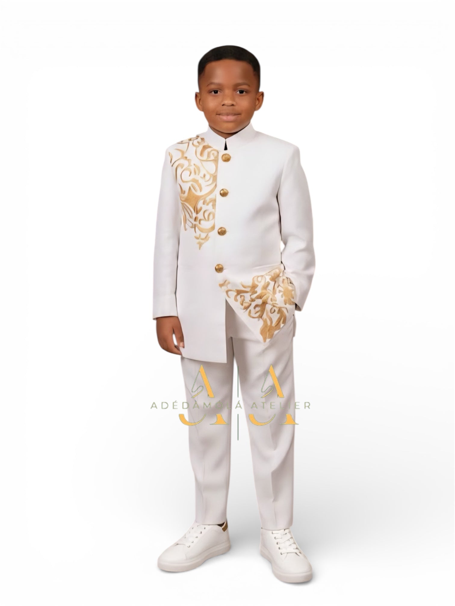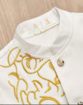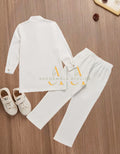 This 2 piece boys outfit features a structured longline top with refined gold detailing, paired with matching tailored trousers for a polished and distinguished look. Available in two classic colour options, this set is perfect for special occasions, cultural celebrations, formal events, and memorable family moments.