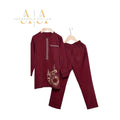 This 2-piece boys African wear set features a beautifully crafted long tunic top with elegant embroidery detailing, paired with matching trousers for a clean, polished finish. The rich wine colour adds depth and luxury, making this outfit perfect for special occasions, celebrations, and cultural events.