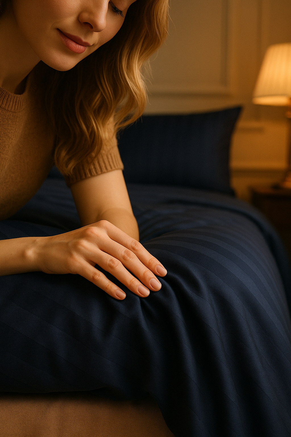 With its sophisticated striped design and rich navy color, SereneNest™ effortlessly blends style and comfort, making it the perfect centerpiece for any modern or classic bedroom.